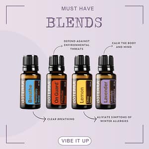 Breathe Blend – This blend is a powerful formula that supports clear breathing and respiratory functions. It includes laurel leaf, peppermint, eucalyptus, tea tree, lemon, and ravensara essential oils. The peppermint helps to soothe sore throats and clear sinuses, while eucalyptus helps to decongest the respiratory tract.
